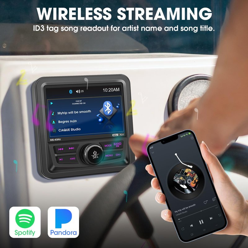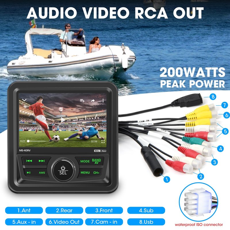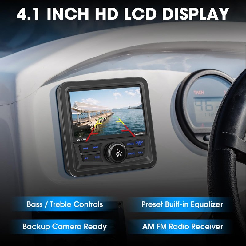- 4.1" Digital LCD Screen & Backup Camera Input: With anti-foggy and anti-reflective technology, the boat sound system features 1024*600 HD resolution, you could enjoy crisp color display, which is easy to read and navigate even in bright sunlight. Mounting a HD backup camera (excluded), a real-time reversing image will be automatically displayed on the atv stereo to make sure safety when backing up