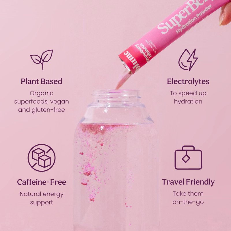 High stress levels, changing diets, and environmental factors can weaken our gut lining and disrupt the balance of our microbiome. That's why we created SuperBelly. Strengthening our gut is essential to preventing unwanted elements from entering your bloodstream, supporting serotonin production, building a healthy immune system, and maintaining overall wellness. Gut health and hydration are interconnected and foundational to feeling your best. SuperBelly combines our love of superfoods with prebiotics (from inulin), trace minerals, fermented apple cider vinegar, and clinically studied probiotics that support a healthy gut flora. Bright, juicy, and tart, this water elixir is quick and easy to prepare. Add to cold water, shake with ice, and enjoy on the go. Experience the benefits of SuperBelly and support your gut health with every sip! Strawberry Hibiscus tastes like tart and juicy pink lemonade with a subtle hint of tropical hibiscus.