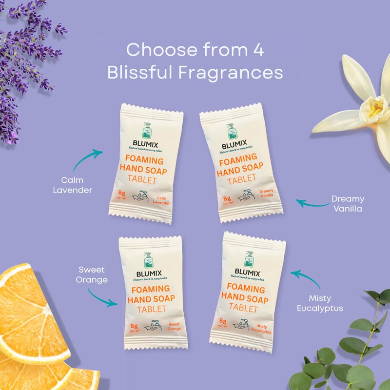 Embrace the eco-clean movement with Blumix’s Foaming Hand Soap Tablets, where sustainability meets effective cleansing! Each tablet creates a rich and gentle lather, giving you the cleaning power you need, without drying out your hands. Designed for convenience and minimal environmental impact, our tablets and their packaging helps you reduce plastic waste and clutter. The tablets are easy to store and perfect for family use, travel, short-term rentals, or any home and office setting. Available in four amazing scents, you can choose a scent that suits your mood: Calm Lavender for relaxation, Misty Eucalyptus for a refreshing cleanse, Dreamy Vanilla for a sweet touch, or Sweet Orange for a zesty wake-up. Switch to Blumix for a clean that’s kind to your skin and the environment.