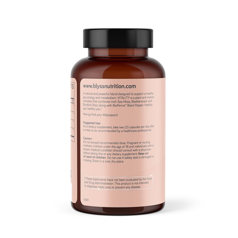 VITALITY is a rich plant based marine complex that combines 3 antioxidant powerhouses; Organic Irish Sea Moss, Bladderwrack & Burdock Root, along with BioPerine Black Pepper for optimal absorption.