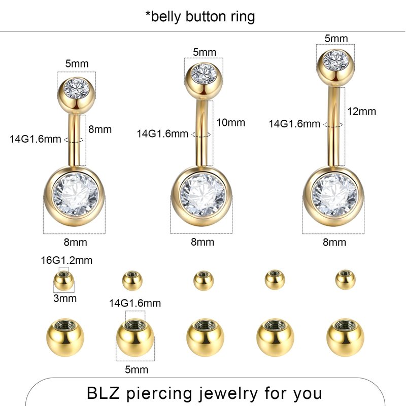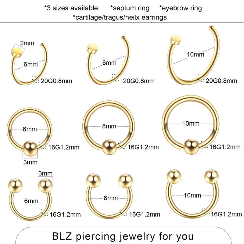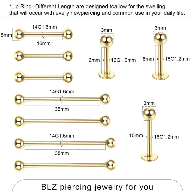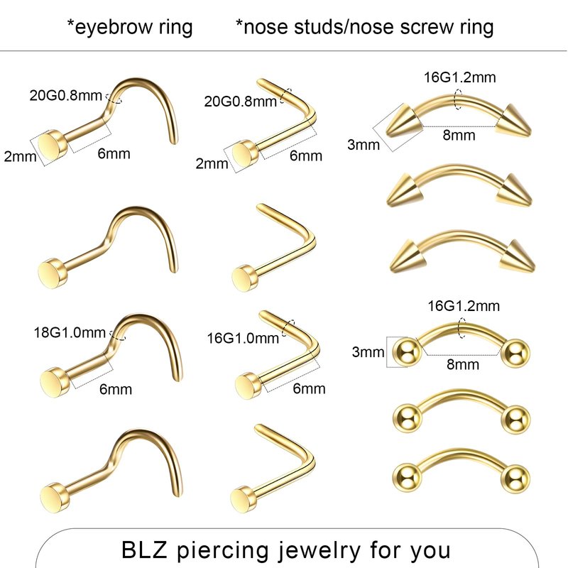 - 【 55PCS Body Piercing Jewelry 】:Total 55pcs with different sizes to meet your personal demand.3pcs belly button ring (14Gauge=1.6*8/10/12*5/8mm); 6pcs-C-shaped nose ring(20G=0.8*6/8/10mm);6pcs-horseshoe nose ring(16G=0.8*6/8/10mm);6pcs-Clicker nose ring and captive ring (16G=1.2*6/8/10mm);8pcs-nose screw studs(18G,20G);4pcs-industrial barbell(14G);6PCS Eyebrow Barbell with Ball/Cone(16G);3pcs-lip ring(16G);3PCS Tongue Rings(14G);10cs-ball replacement(14G,16G).