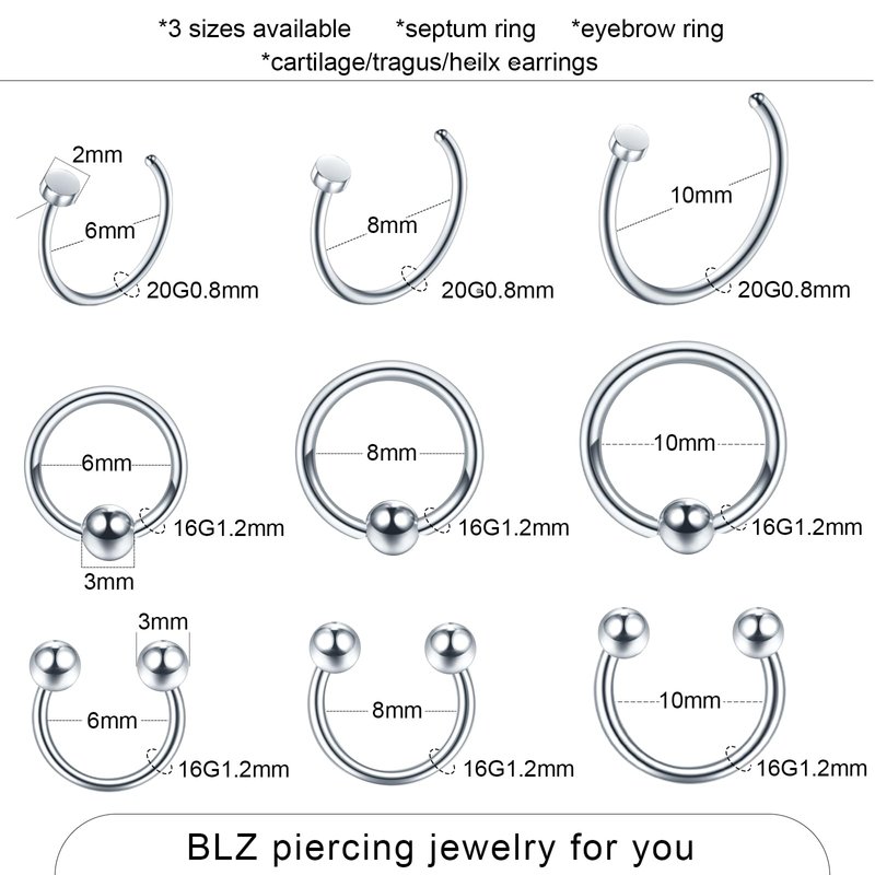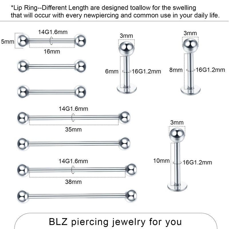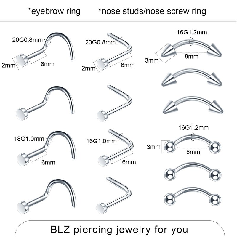 - 【 55PCS Body Piercing Jewelry 】:Total 55pcs with different sizes to meet your personal demand.3pcs belly button ring (14Gauge=1.6*8/10/12*5/8mm); 6pcs-C-shaped nose ring(20G=0.8*6/8/10mm);6pcs-horseshoe nose ring(16G=0.8*6/8/10mm);6pcs-Clicker nose ring and captive ring (16G=1.2*6/8/10mm);8pcs-nose screw studs(18G,20G);4pcs-industrial barbell(14G);6PCS Eyebrow Barbell with Ball/Cone(16G);3pcs-lip ring(16G);3PCS Tongue Rings(14G);10cs-ball replacement(14G,16G).
