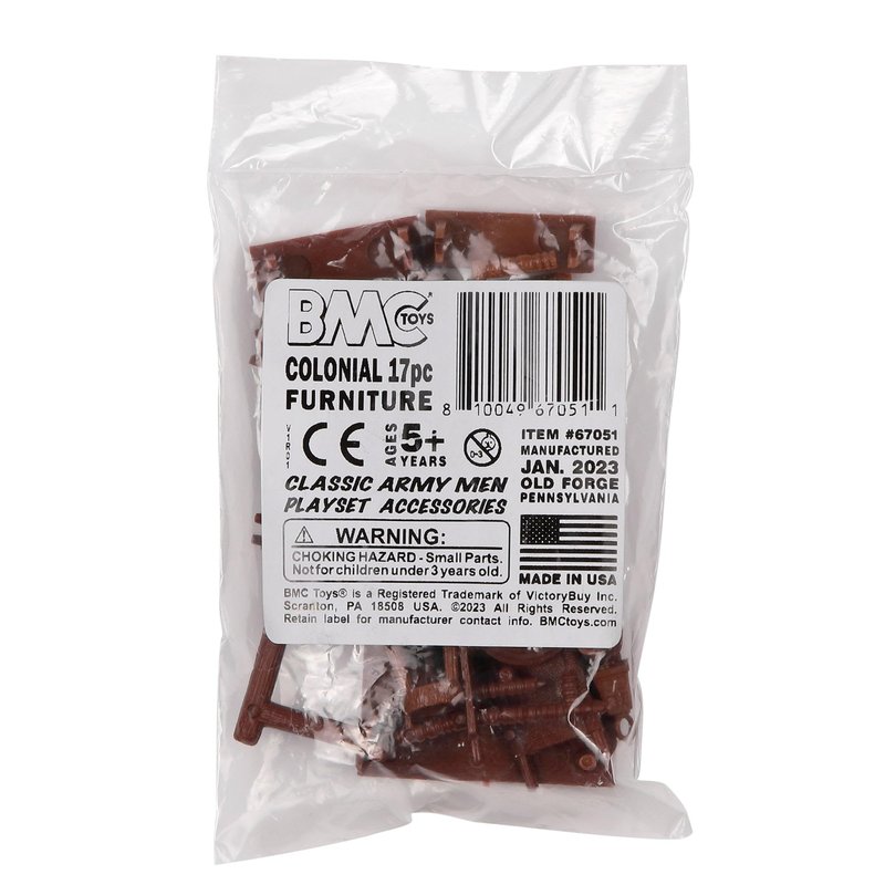 From the CLASSIC ARMY MEN COLLECTOR SERIES, BMC Toys brings back more classic playset accessories from yesteryear. This 14 piece set includes a variety of American Colonial era furniture and accessories. Pieces are made from slightly stiff brown color HDPE plastic. Pieces include chair. rocker, 3 stools, bench, table, 2 lanterns, spinning wheel, musket stack, cast iron kettle, and horse hitching post.