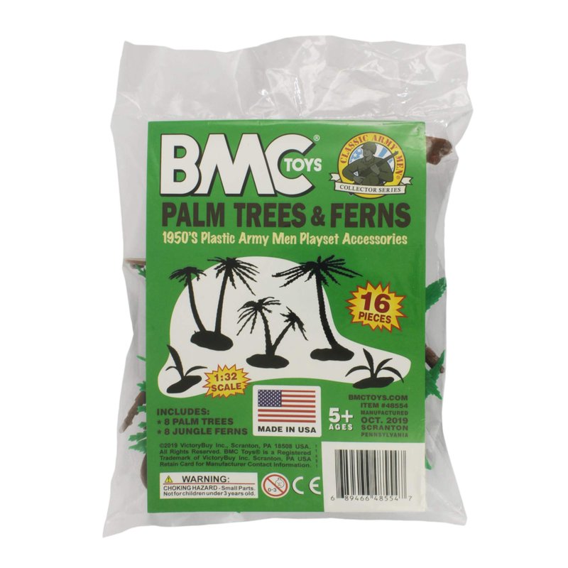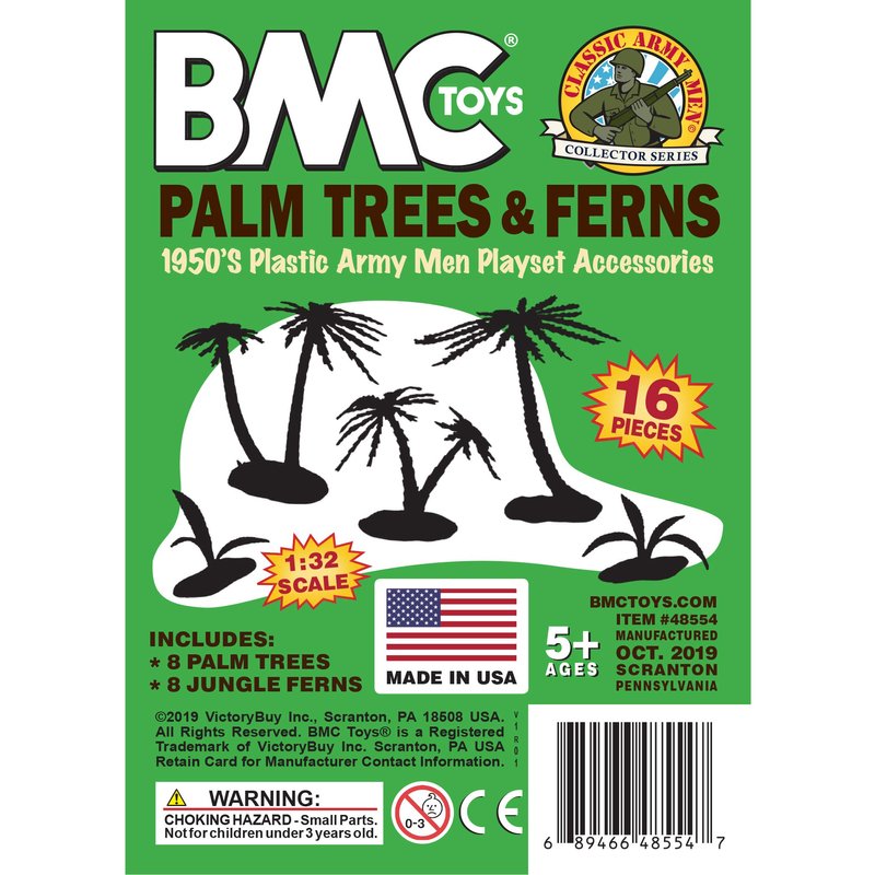 From the CLASSIC ARMY MEN COLLECTOR SERIES, BMC Toys brings back another American toy from yesteryear. This 16 piece set of playset accessories includes 8 Palm Trees and 8 Jungle Ferns. Leaves are made from fairly flexible green color LDPE plastic and trunks and bases are slightly stiff brown color HDPE plastic. Tallest tree measures 5 inches tall.
