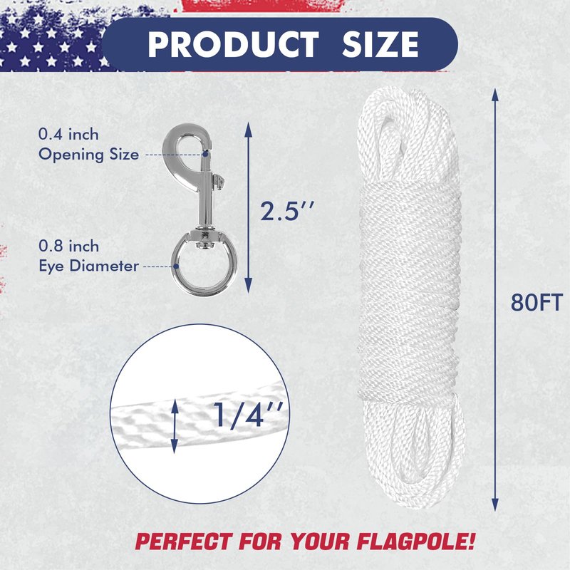 - 【Flag Pole Rope Kit】: You will receive a white flagpole rope which is 80Ft long,it can be used for a 25ft or 40ft flagpole. The package also includes 4 pcs swivel snap hooks made of silver zinc alloy, The nylon rope has a very high class feel and enough to meet your different demands, also suitable for outdoor flagpole use.