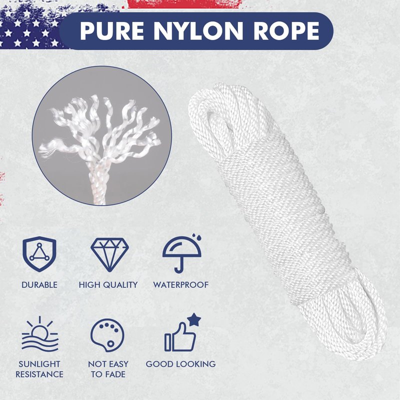 - 【Pure Nylon Material】: Flag Pole Line Rope is made of 12 strands of high-strength nylon,1/4-inch in diameter, soft touch and durable, not easy to break and can easily fit through the eye of the clips.