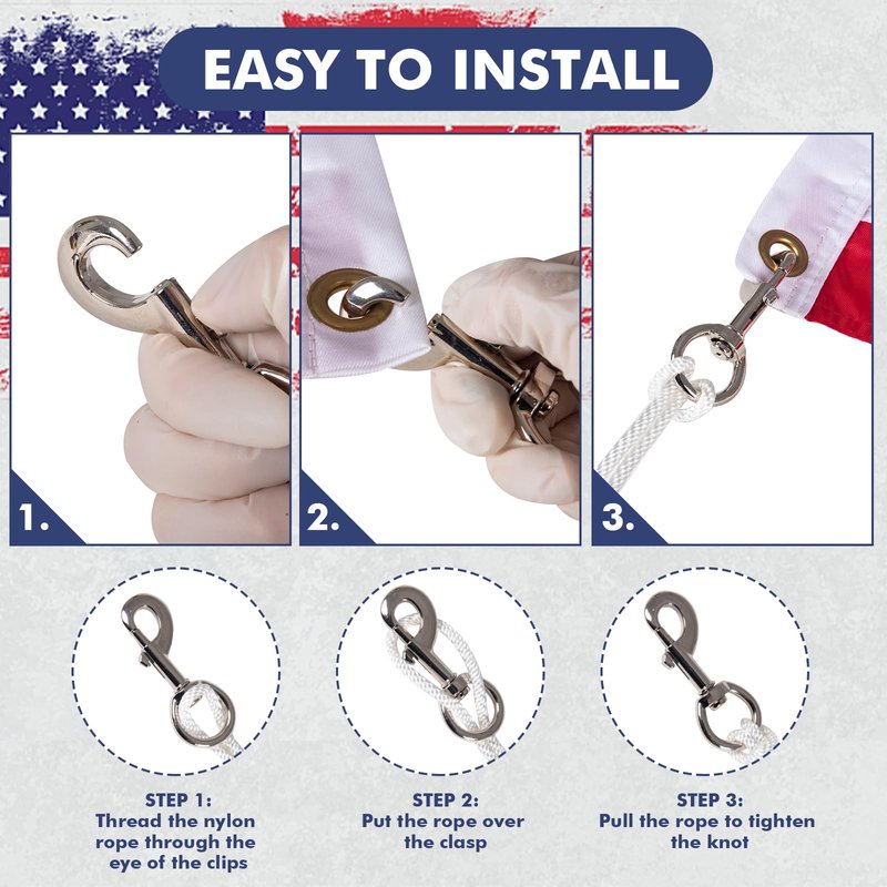 - 【Easy to use】: Thread the nylon rope through the eye of the clips, put the rope over the clasps, then Pull the rope to tighten the knot. It only takes a few simple steps to install your flag!