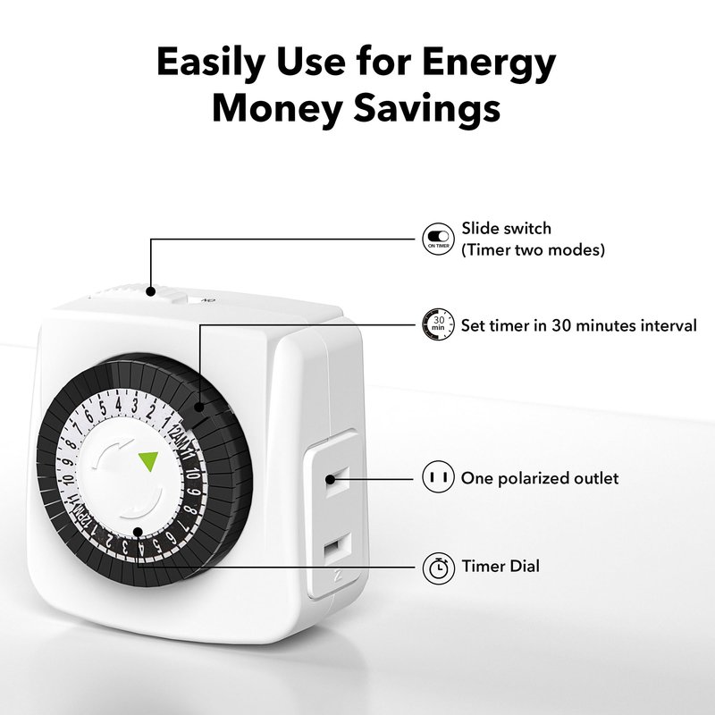 - ✓ DESIGN YOUR OWN SCHEDULE: With up to 24 on and off settings per day, you can program your devices to turn on/off in as small as 30-minute intervals by the 2 prong timer plug. Settings will repeat daily once programmed and plugged-in
