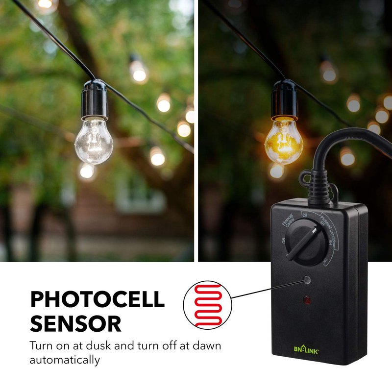 - ✓ PHOTOCELL DUSK TILL DAWN: Built-in light sensor timer, automatically turn outlets on at dusk and off at dawn, or on at dusk and off after 2/4/6/8 hours, repeats daily