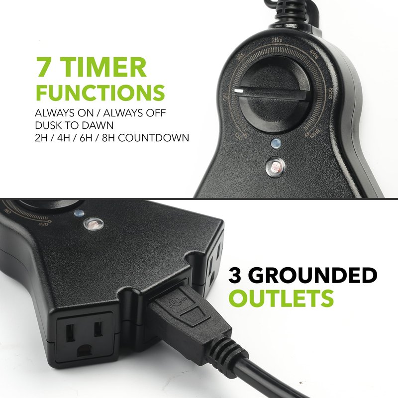 - ✓ PHOTOCELL DUSK TILL DAWN: Built-in light sensor timer, automatically turn outlets on at dusk and off at dawn, or on at dusk and off after 2/4/6/8 hours, repeats daily
