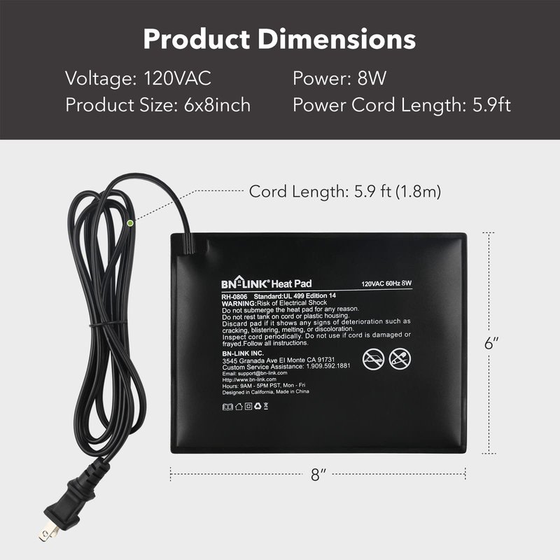 - MADE FOR REPTILES: Voltage: 120 volt, Power: 8 watt. The 6" x 8" model is perfect for a 10 -20 gallon terrarium and it can easily put out steady heat between 104℉ and 122℉. Each unit comes with BN-LINK’s strong 15-month warranty.