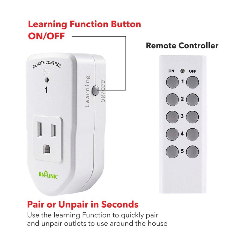 - READY-TO-GO: Each BN-LINK Wireless Remote Control Outlet Kit contains everything you need to start(even the remote batteries!). Simply plug and play, or sync up the outlets to suit your needs.