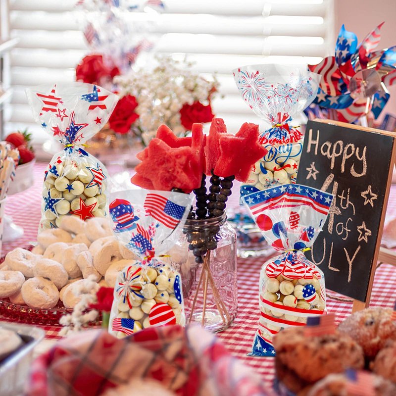 - 【Lovely Design】4 styles such as festive firework, USA balloons, USA star, American flag printed patterns, simple and cute. The most interesting blue red patriotic cellophane treat bags design is enough to suit your party supply.