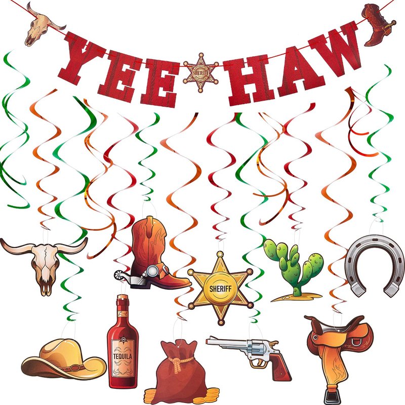 - Package you will get: the package consists of 1 piece cowboy Yee Haw banner, 20 pieces hanging swirl decorations, come with bright colors and various designs, there are 21 different characters in this set, sufficient quantity can satisfy your decorative needs