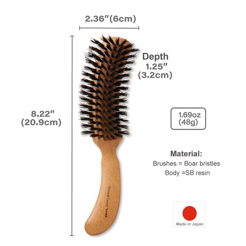 - [ Size, Weight and Material ] 2.36 x 1.25 x 8.22 inch ( 6 x 3.2 x 20.9cm) 1.69oz ( 48g) Material: Brushes = Boar bristles Body =SB resin
