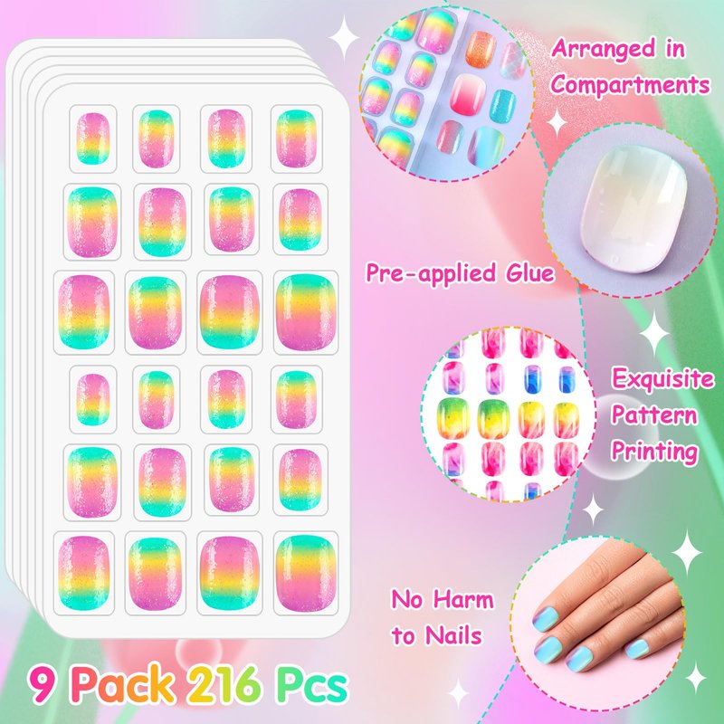 - 【Package Content】Each box contains 24 gradient style stick on nails for kids, 9 boxes, a total of 216 pieces, each press on nails for kids feature unique charm, colorful, whether for daily wear or holiday dress, these carefully designed press on nails can add extra charm to children's clothing
