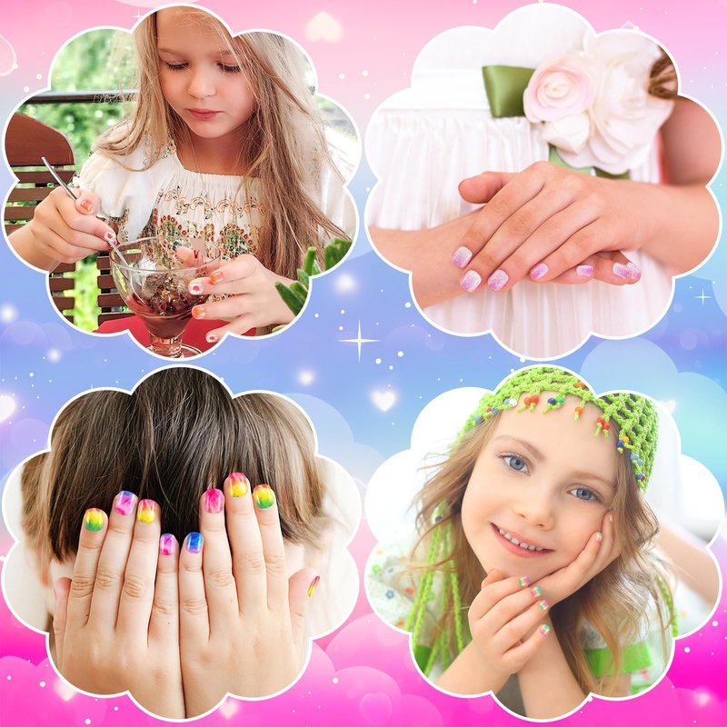 - 【Durable and Long-Lasting】The kids press on nails girls set is made of good quality ABS material for wonderful durability. These fake nails for kids are well made, not easy to fall off, maintain a good look even during activities and play. Let your child enjoy beautiful nail decorations for a long time without frequent replacement, saving time and cost