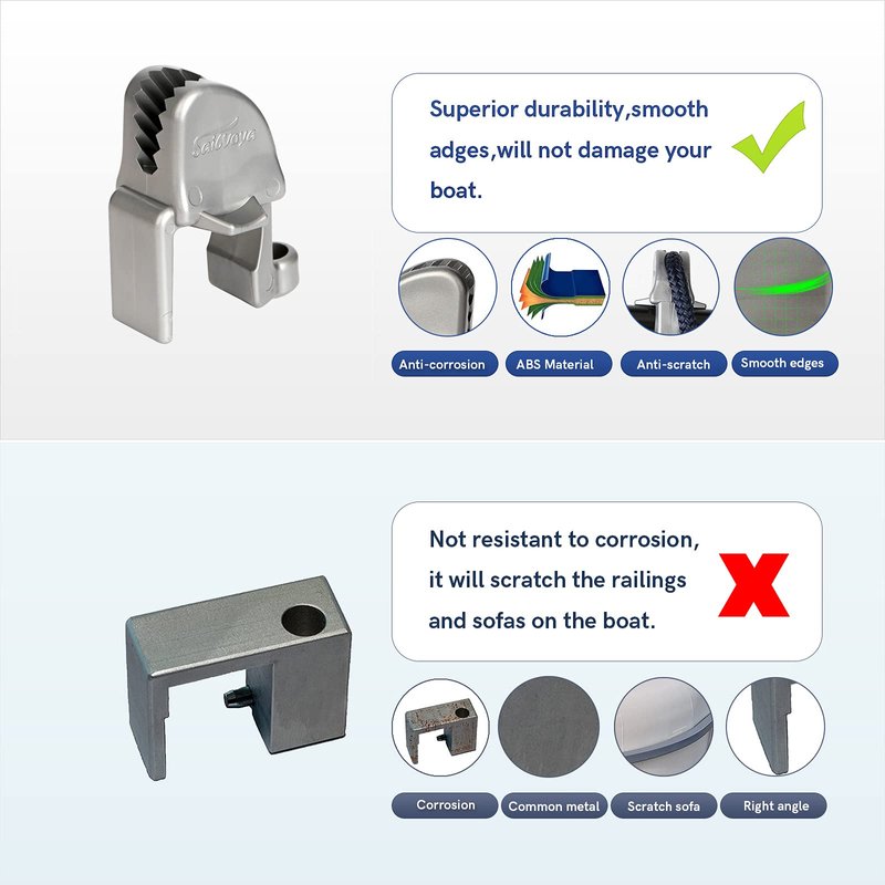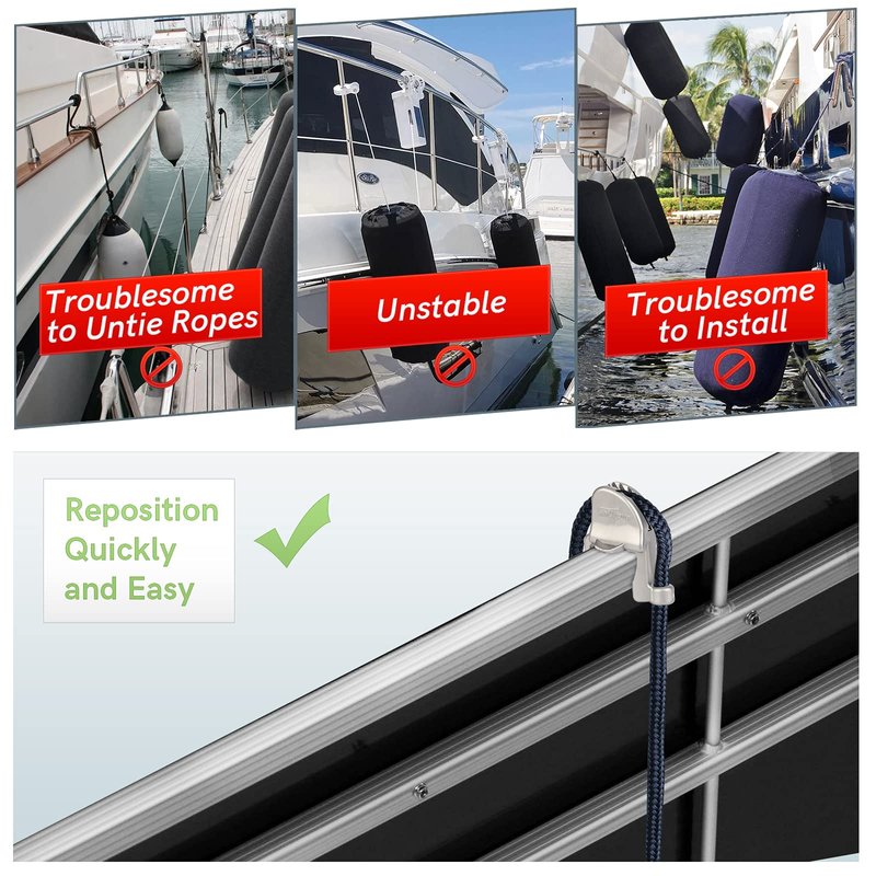 - Features: Boat fender clips can help you adjust the position of the fender easily and quickly to suit different docking situation. This is a pontoon fender clips focusing on efficiency and convenience.