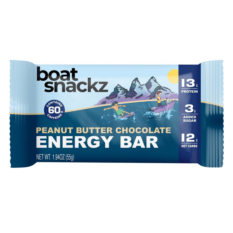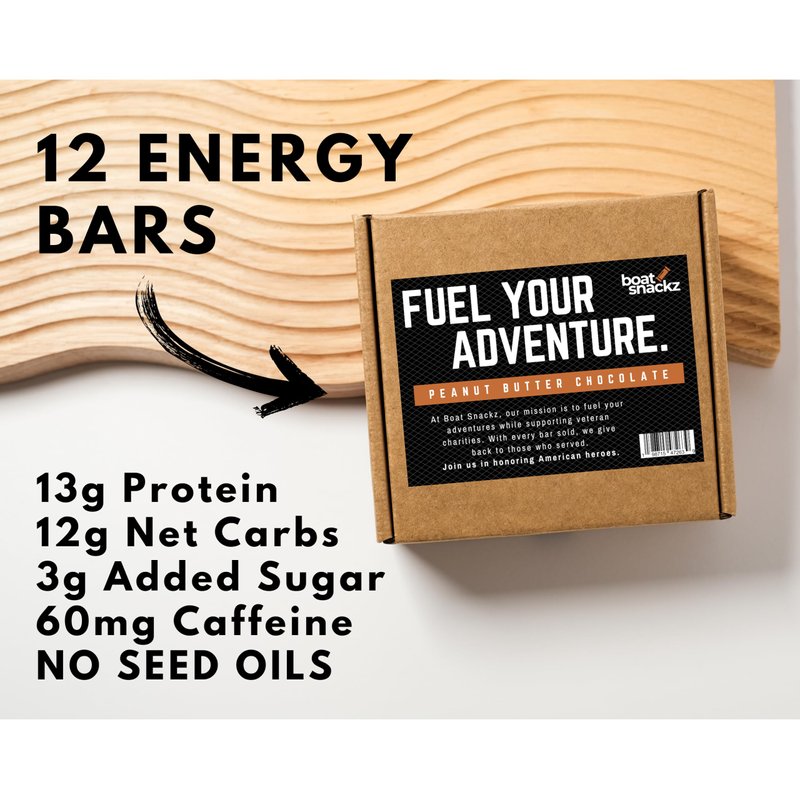 Boat Snackz - Peanut Butter Chocolate, Energy Bars (12 Pack) 13g Protein, 3g Added Sugar, 12g Net Carbs, 60mg Caffeine, No Seed Oils (55g bars) Made in USA - Supports Veteran Charities