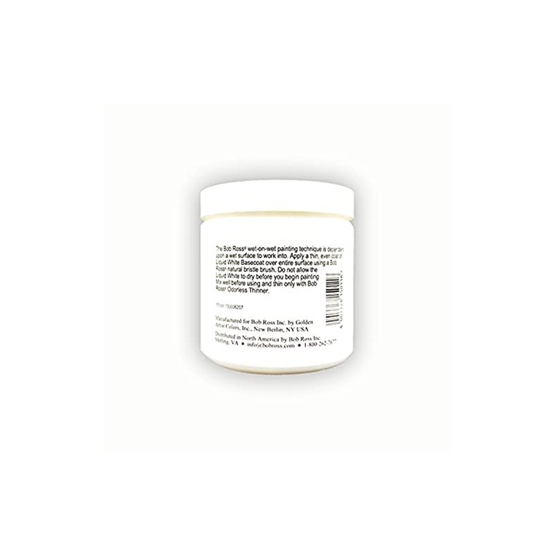 Bob Ross Liquid White is one of three Bob Ross Liquid Basecoats essential to the Bob Ross Wet-On-Wet Technique. This basecoat allows painters to actually blend and mix colors right on the canvas rather than working on a palette. Can also be used to thin other colors for application over thicker paints. The idea that a thick paint will stick to a thick paint is the basis for this technique. Liquid White, 250ml jar