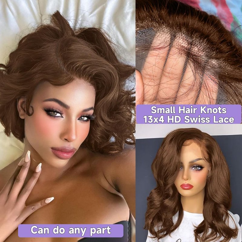 - HD Lace Front Wigs Human Hair:HD Transparent 13x4 Ear to Ear Chocolate Brown Lace Front Human Hair Wig Free Part Big Lace Parting Space.Durable Swiss Lace Bob Wig Human Hair Match All Type Skin Colors and Look More Natural .Can Make Middle Part and Side Part,C Part. Can Make Ponytail & Bun,Our Bob Wig Human Hair is Medium Cap Size(21.5Inch - 22.5Inch) with 3 Combs and Adjustable Straps, Easy to Adjust, It Can Help You Fixed on Your Head,More Easy to Wear.