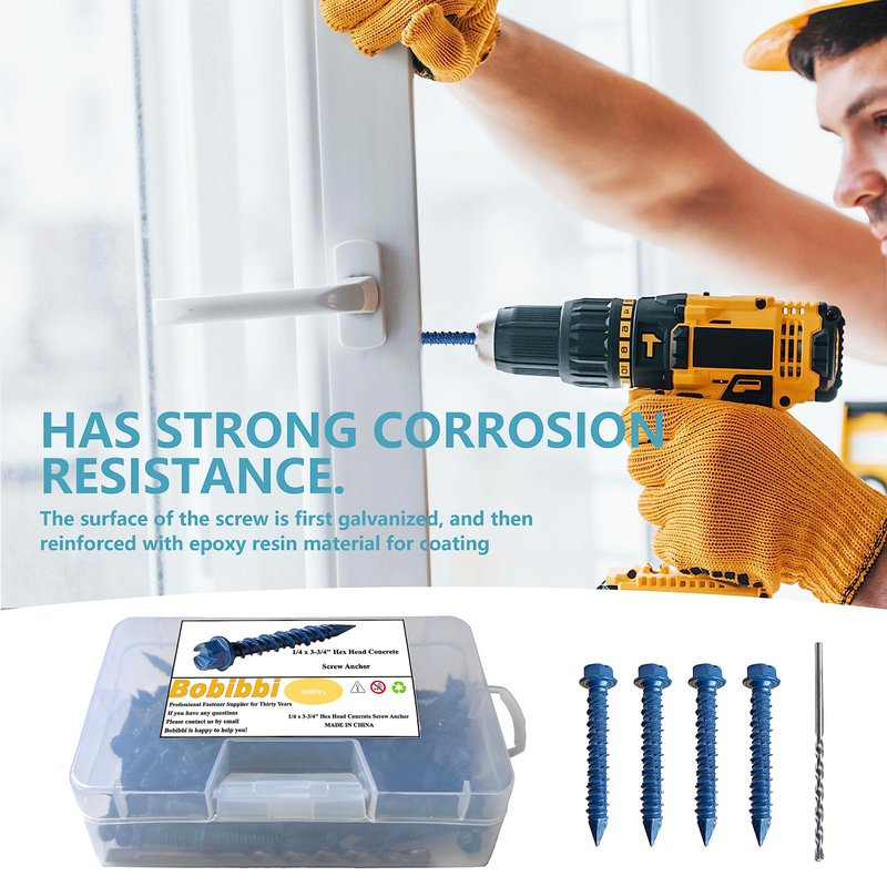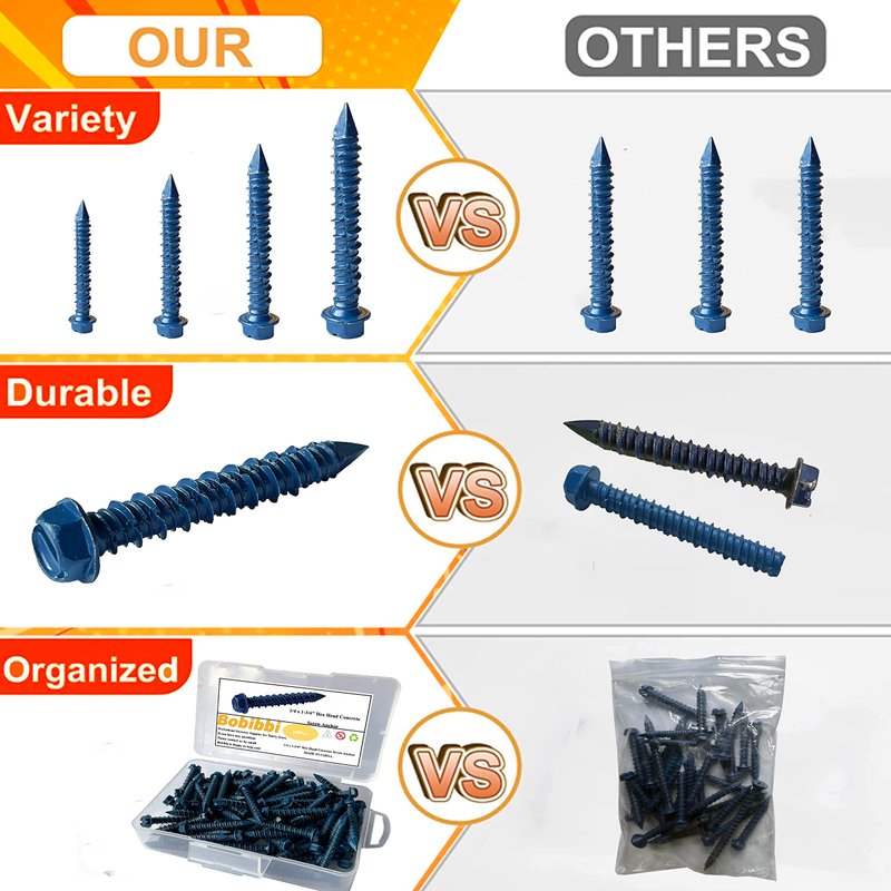 - 【SERVICE】Bobibbi's lifelong commitment to quality service. We really care about our customers, and we're sure you'll like our Concrete Screws. That's why we offer a worry-free lifetime warranty on all our products. If you are not satisfied with any aspect of our products, we will give you a full refund. We produce Concrete Screws with the utmost attention to detail to provide the most efficient fastener experience. You can safely add our products to your shopping cart.