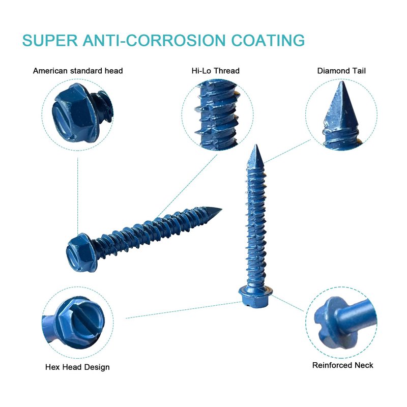 - 【HIGH QUALITY】High and low thread concrete screw fixation ability. It can quickly penetrate concrete slabs, bricks, etc. Concrete screws are made of 1022A high quality carbon steel and can withstand hydrochloric acid corrosion for 1000 hours. Unique diamond tail for faster drilling speed.