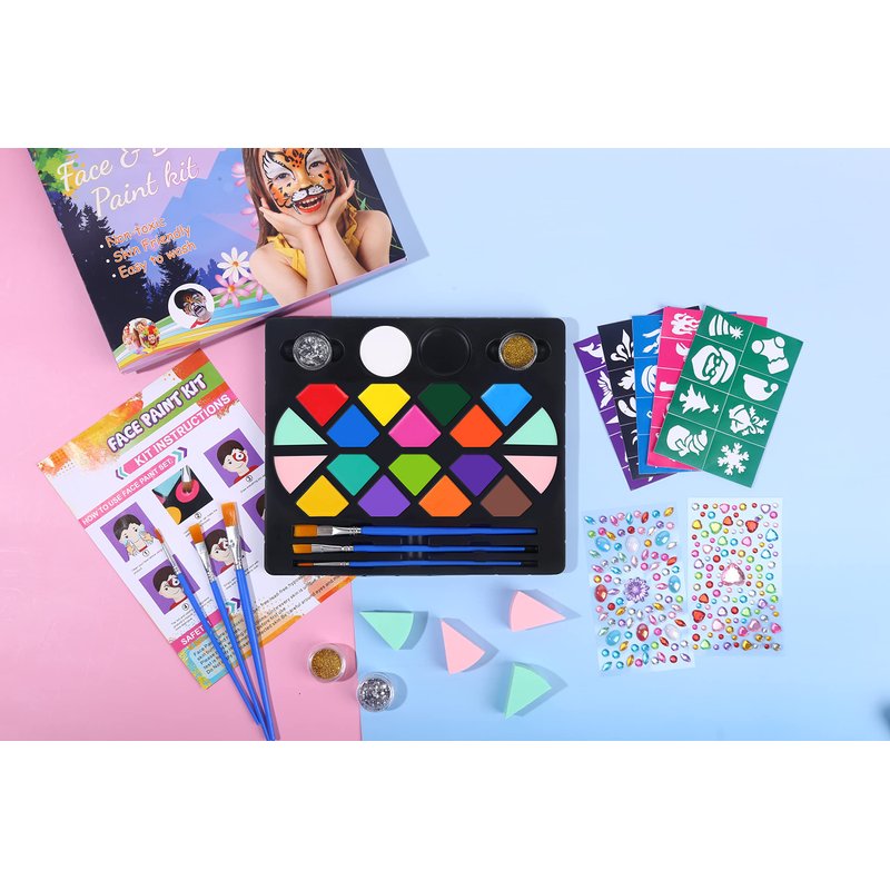 - 【Face & Body Paint Kit】Our face painting kit includes 16 bright colors and extra large black & white,2 glitters,3 brushes,5 face paint stencils,4 sponges,2 gem sheet,1 instructions.For everything you need to make a perfect look.