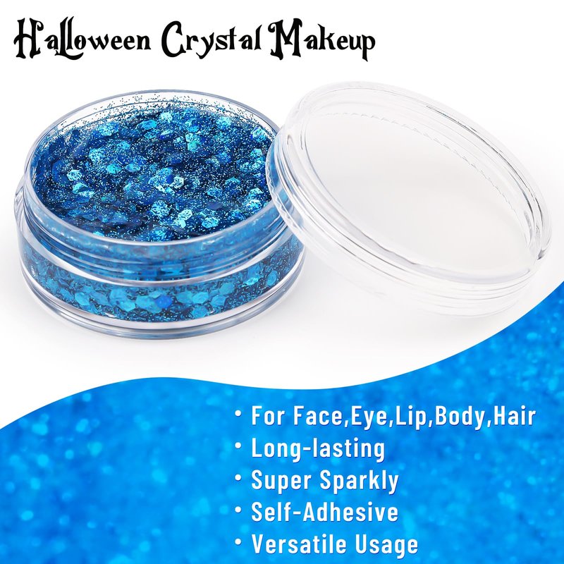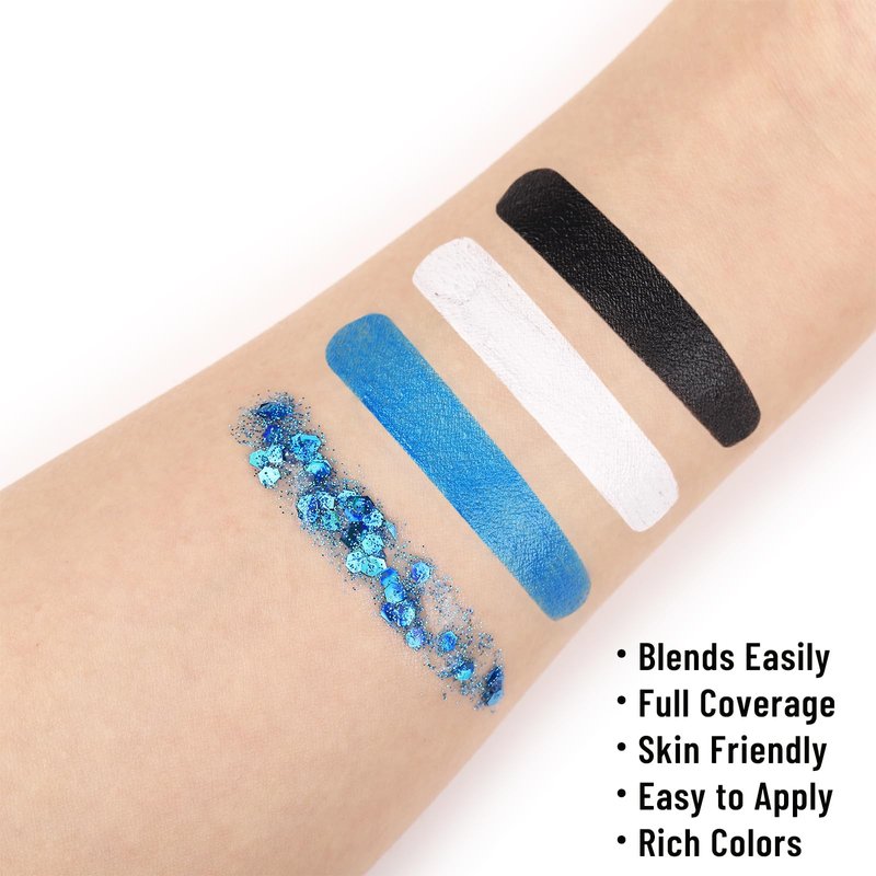 - Specific Halloween Face Painting Set - This kit includes everything you need to create stunning Halloween looks: black, white, and blue oil-based face paints, along with a vibrant blue body glitter gel and glitter freckles face tattoo. Ideal for spooky and creative costumes, this kit adds depth and shine to your Halloween makeup