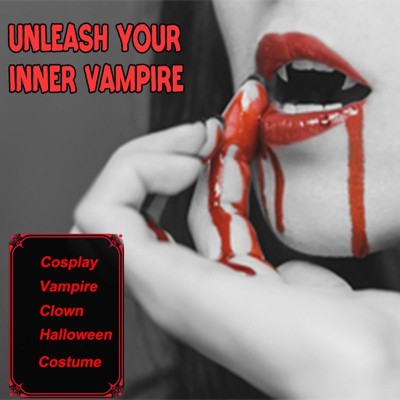 - Fake Blood+Vampire Teeth Set: Includes everything you need to transform into a vampire, 1.7oz dark fake blood+0.51oz blood gel+3 pairs vampire teeth+teeth glue and tweezer. Perfect for creating a convincingly eerie appearance.