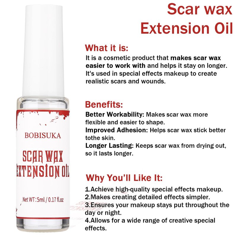 - Suitable for All Skill Levels: Whether you’re a professional makeup artist or a beginner, Scar Wax Extension Oil is easy to use and perfect for creating detailed, high-quality special effects makeup for theatrical performances, film, cosplay, Halloween, and more.