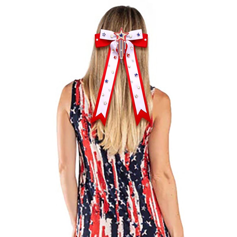 - Patriotic Hair Bows:Ready to shine brighter than the fireworks this 4th of July with our beautiful American flag hair bow clips for women!Features the red white and blue silky satin hair clips in classic bowknot design with stars charms and sparkling rhinestone crystals embellished,fully of USA patriotic spirit.4th of July hair bows perfect for any holiday festivity....From the BBQ to the Fireworks this red white blue hair bows will surely turn heads!!!