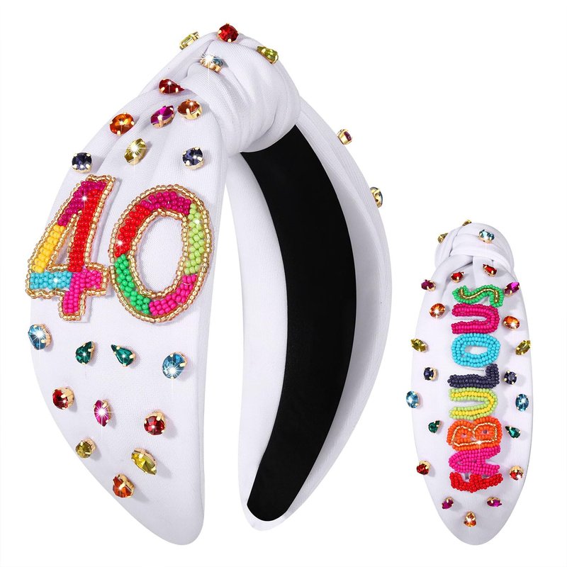 - Let everyone know it's your big day with this birthday headband for Women!This fun birthday decorations headband features a white top knot headband with "40" and “FABULOUS” spelled out in colorful seed beads each side, and embellished with multi-coloured crystal rhinestones .these shiny crystal and sparkly numbers bring a glam touch to your birthday party outfit.Be the center of attention at your birthday party with this rhinestone encrusted beaded FABULOUS 40th Birthday Headband.