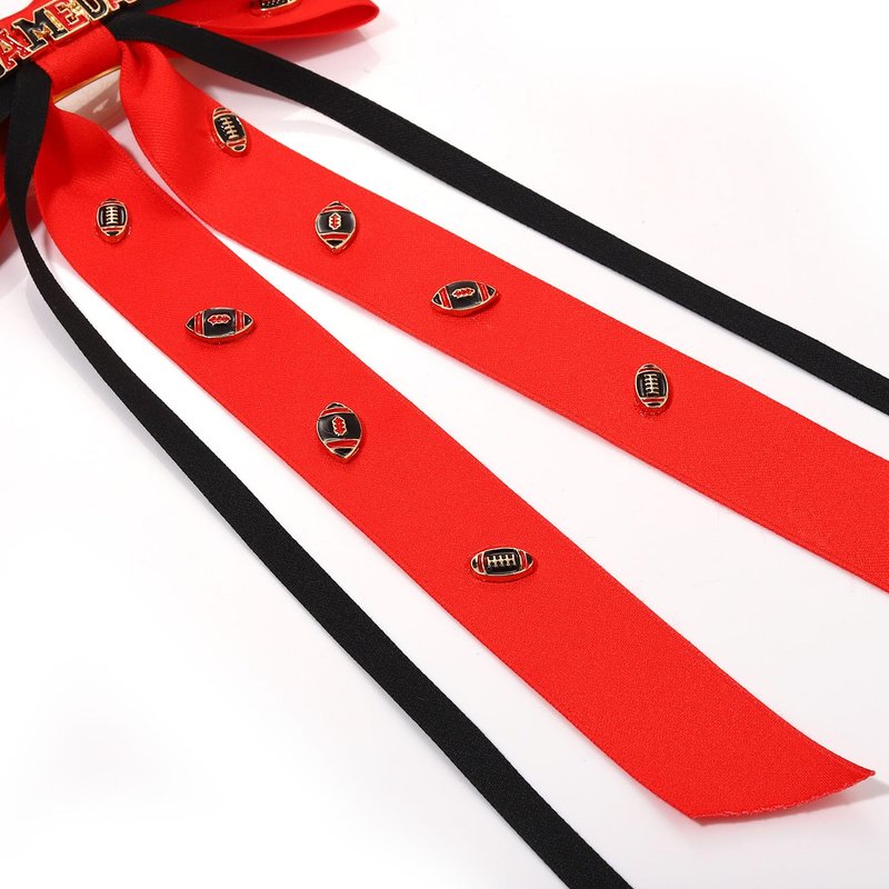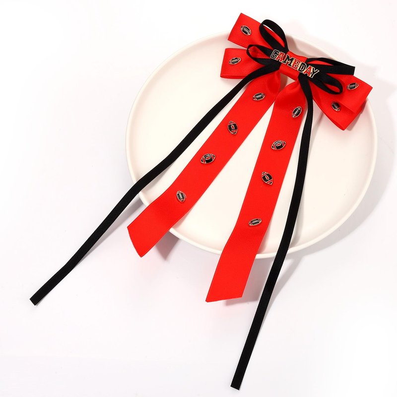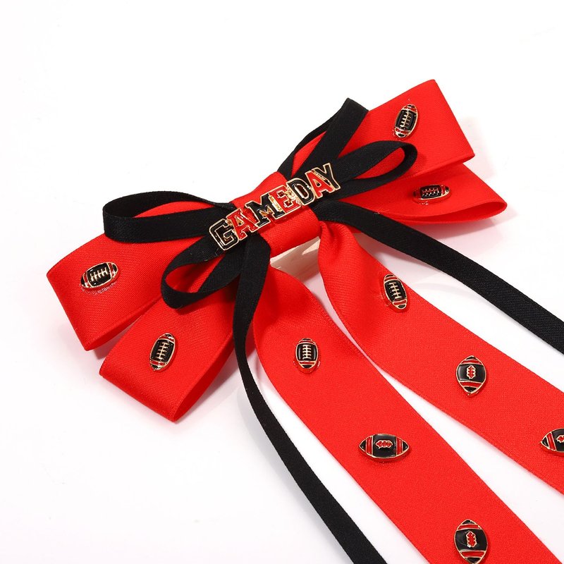 - Style your hairdo in a variety of chic fashions with this game day hair bows for women. This game day bow barrette hair clip featuring a double layer silky satin ribbon bow with long tails in team color red and black,embellished with GAME DAY and football charms, and back attached on top of a barrette metal clip, this game day hair accessories neatly secures your hair and works well with all hair types.Enjoy this fun football hair bow clip to pair with your outfit at the next tailgate or sporting event!