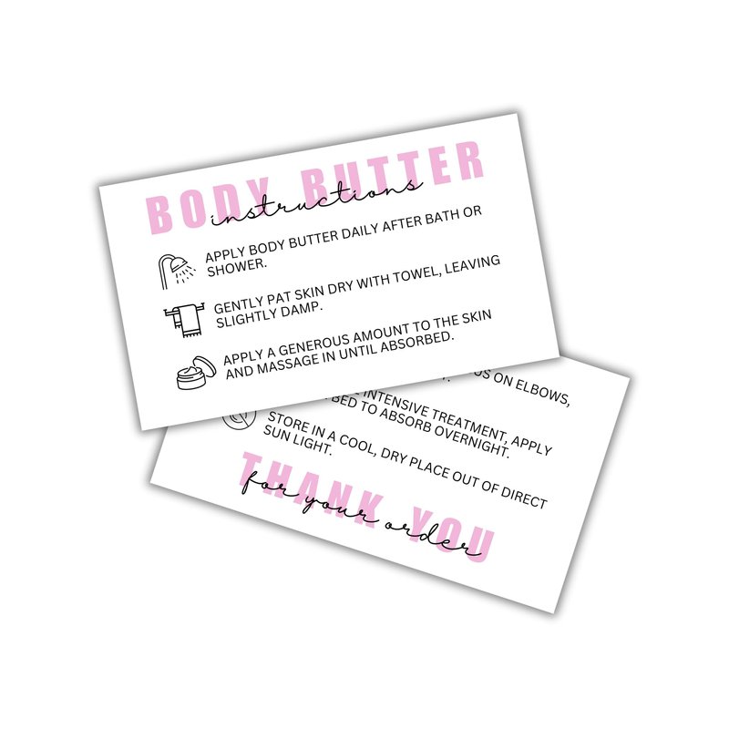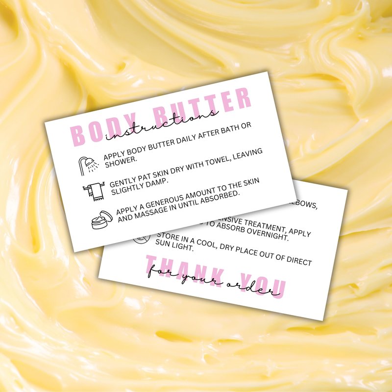 Each card includes detailed instructions for using and storing body butter, ensuring optimal results for smooth and hydrated skin. Enhances the presentation of your body butter with professional and informative inserts, impressing customers with your attention to detail.
