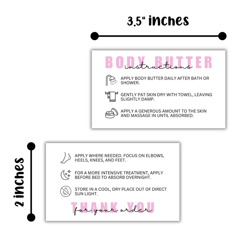 - Comprehensive Usage and Storage Instructions: Each 2x3.5” Body Butter Care Instruction Card includes detailed instructions for using and storing body butter, ensuring customers achieve optimal results for smooth and hydrated skin.
