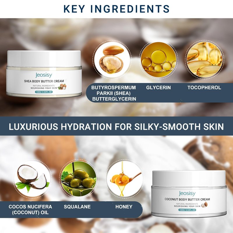 - Care for Your skin: Our Shea Butter Body Cream is rich in essential fatty acids and minerals to create a natural protective barrier for your skin, relieve dryness and roughness, promote skin repair and renewal, and leave you with smooth, supple skin. Our Coconut Body Butter Cream is rich in natural antioxidants such as vitamin E and coconut oleic acid, which can effectively fight skin damage caused by free radicals and protect your skin from UV rays and air pollution in your daily life.