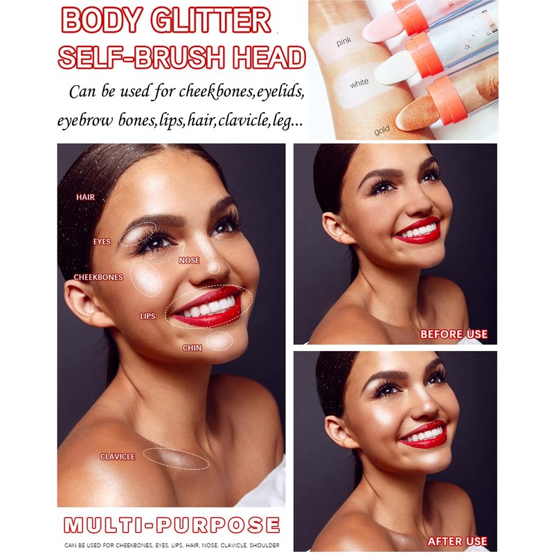 - MULTI-USE GLITTER POWDER- This glitter powder can be used not only on face to protrude your silhouette, but also on the clavicle, shoulder, leg and hair to create flashpoint. Great for brightening cheekbones, eyelids, eyebrow bones, inner corners and lips to brightens and perfect skin, to create a shimmery look and amplify your charm. They suitable for all skin tone
