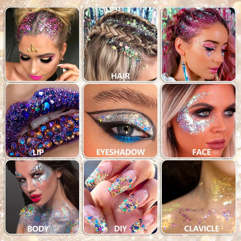 - Wide Applications: This cosmetic chunkuy glitter is perfect for your hair, eye, lip, face, body, nail and more, perfect for rave hair accessories and face glitter rave. Specially prepared for festival, party, carnival, costumes, theme parties, Christmas,etc.