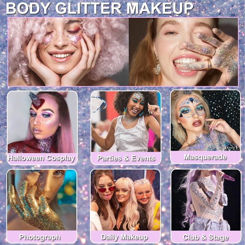 - Body Glitter Makeup: Chunky Glitter sequins add more dazzling light to the makeup, not only a face glitter, but also a glitter gel for body and hair, apply glitter on the collarbone and shoulder position, you can find the whole person glittering and highlighting your personal style more