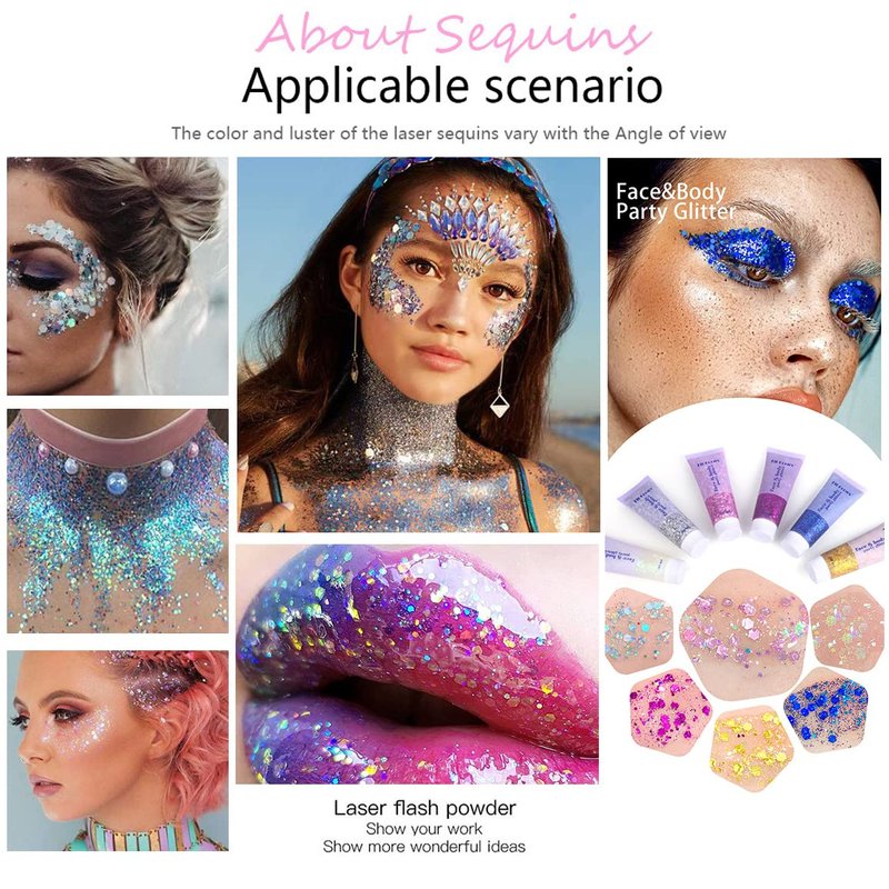 - 【Widely used】This cosmetic chunky glitter flake gel is perfect for your body from head to toe: face, body, eye shadow, lips, cheeks, hair, nail art and more. At weddings, Halloween, Christmas, bars, parties, shows and more it can make you more glamorous and sparkling.