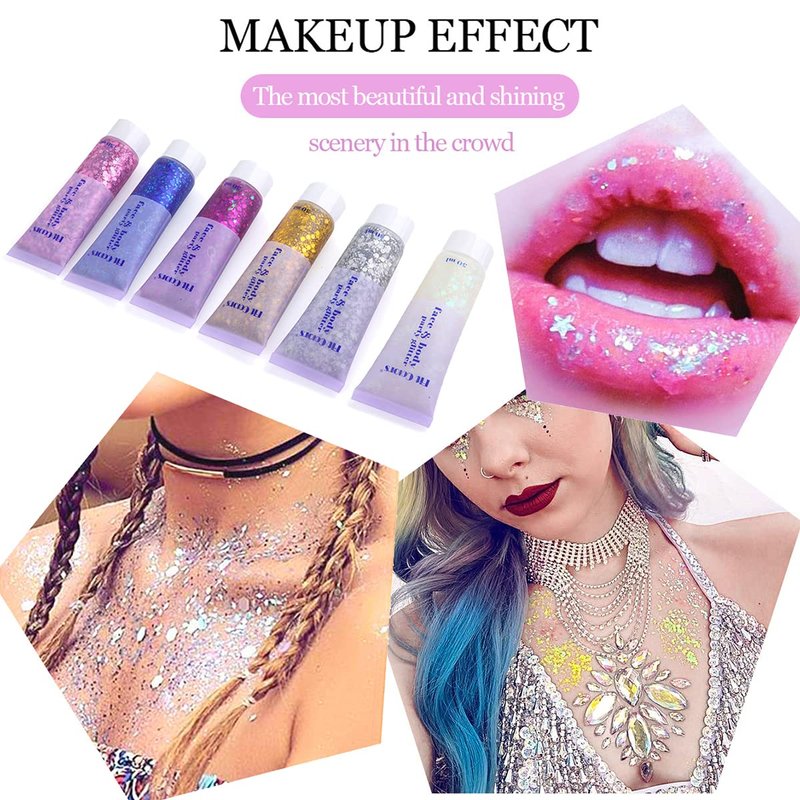 - 【Sparckle Body Glitter Gel】This body glitter is made of holographic glitter, which is light and durable. The glitter gel has little stars, little moons, and hexagonal sequins inside, which are very shiny and gorgeous and make your makeup more charming and eye-catching.