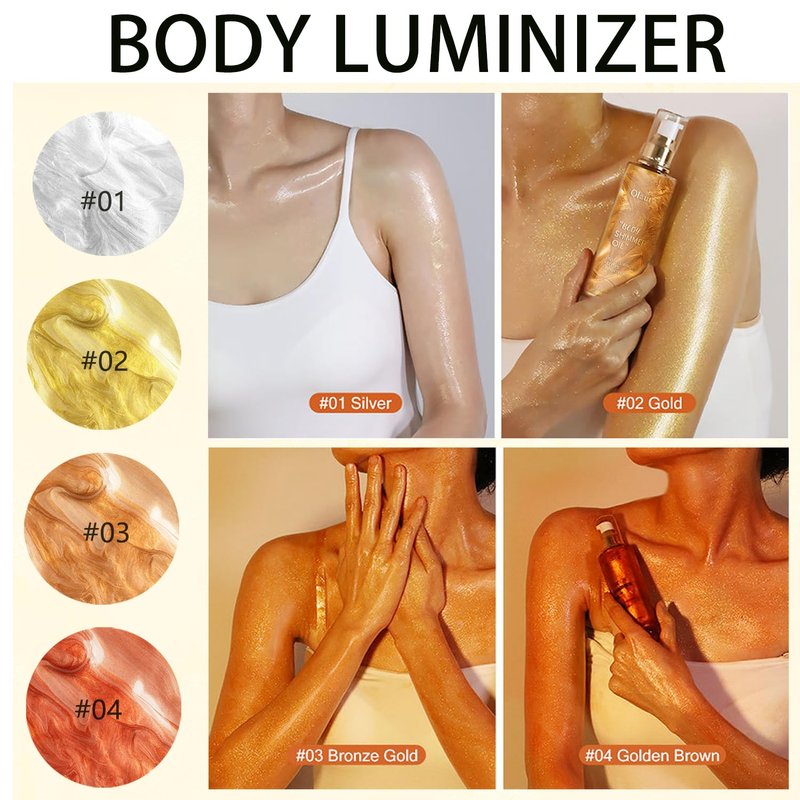 LIQUID BODY LUMINIZER - This shimmer body oil & body highlighter is a common decorative oil for face and body, it can increases facial light, brings luster, gives your skin an attractive shimmer in the sun. Suitable for parties, dating, summer activities, beaches, outdoor and other occasions.