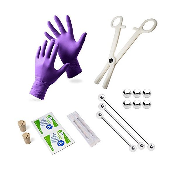 - 18PCS Piercing Kit includes: (3Pcs) 14G Industrial Barbells; (6Pcs) Replacement Balls 6mm; (2Pcs) 14G Needles Are 100% Sterilized using ethylene oxide (EO) gas; (2Pcs) Safety Needle Corks, (1Pc) Limited Edition Forceps Clamps, (2Pcs) Pair of Latex Gloves - Large; (2Pcs) AlcoholPads.