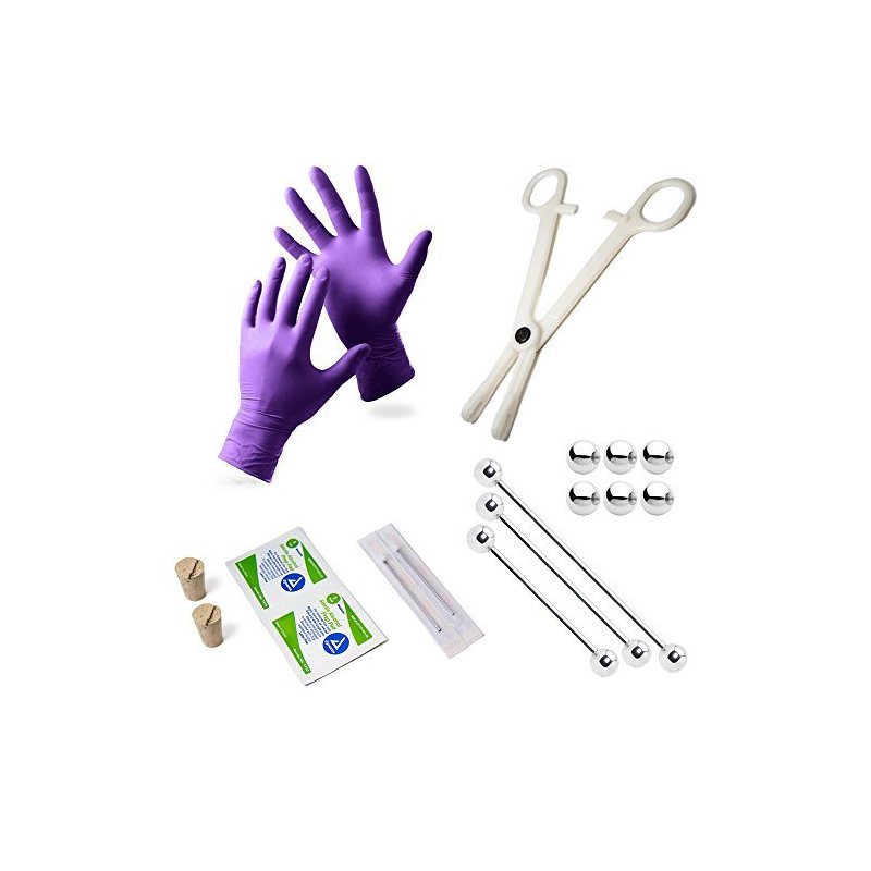 17-Piece industrial earring piercing kit Kit includes: - (1) 14ga-28 mm barbell, (1) 14ga-32 mm barbell, (1) 14ga-36 mm barbell - (1) Disposable forceps - (2) 13ga needles, (2) piercing corks, (2) sanitizing wipes - (6) 6 mm end balls, (1) Pair piercing gloves All jewelry is 316L surgical steel and perfect for initial piercings Needles are 100% sterilized using ethylene oxide (EO) gas