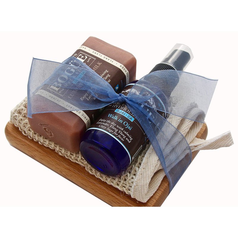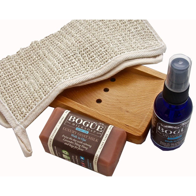 BOGUE Luxury Goat Milk Soap & Pure Essential Oil Hydrolyzer Giftset -N°6 'Walk in Ojai' Lavender, Sage Ylang Ylang on Beech Wood Soap Dish with Sisal Cloth