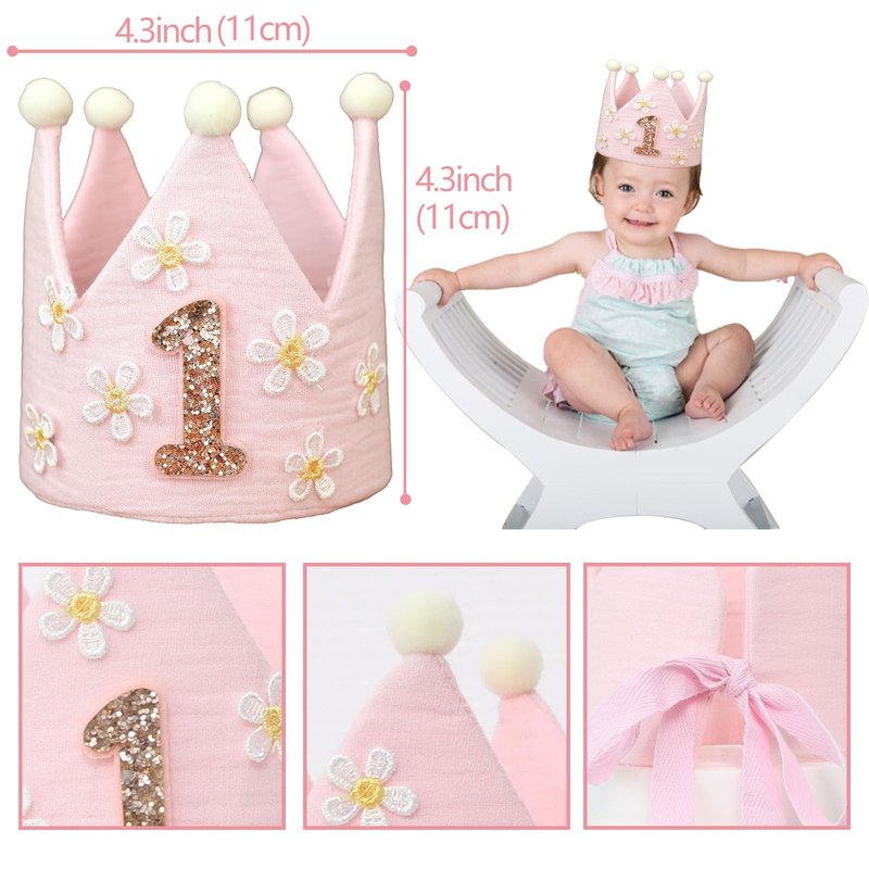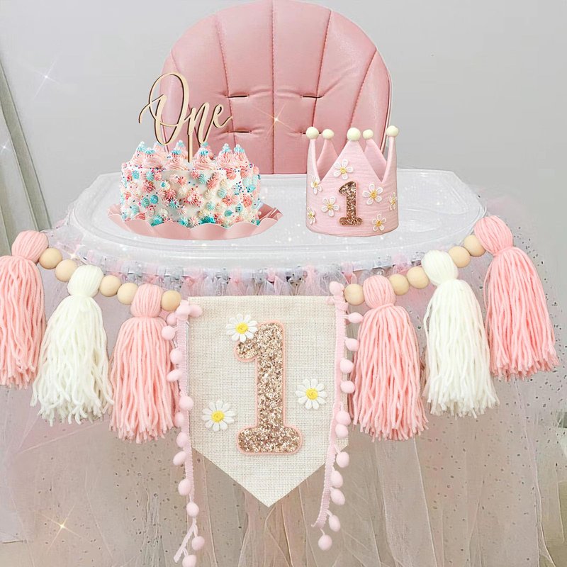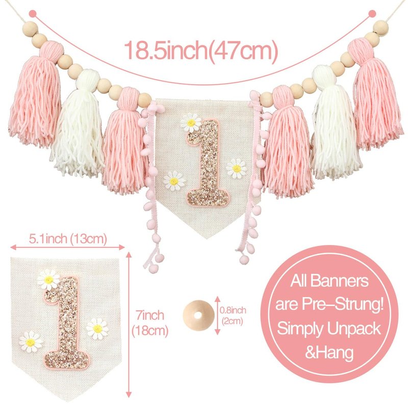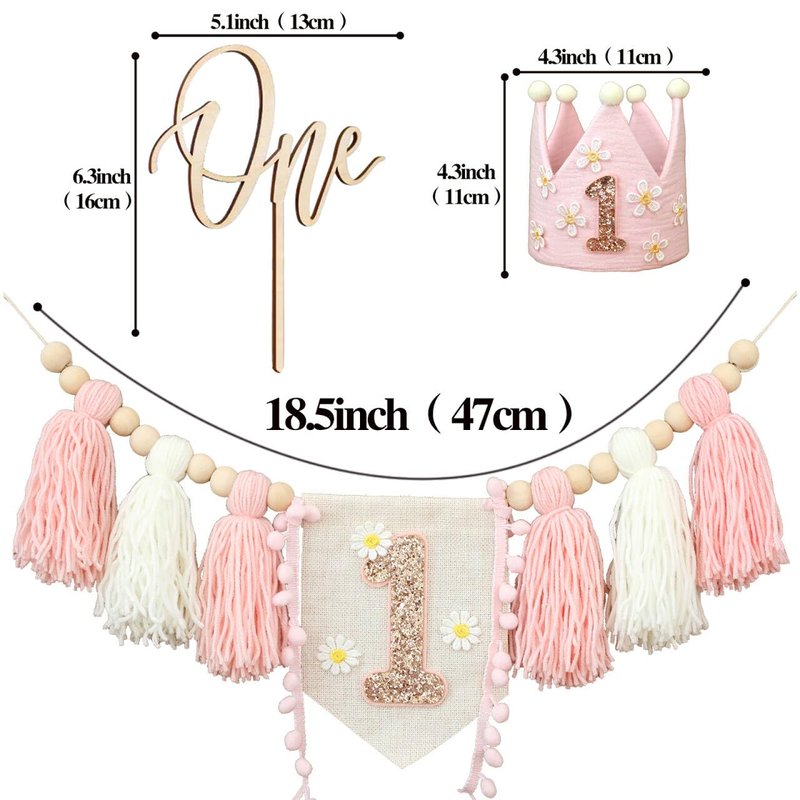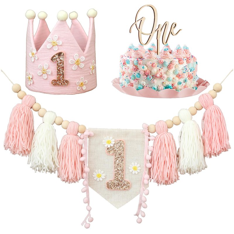 - PACKAGE CONTENTS: A tasseled garland banner with the number 1 and daisy motifs in white and pink; a pink crown hat with daisy motifs and the number one; a one cake topper; The set is beautifully coloured and fits perfectly with the daisy theme; Add a touch of colour to your baby's birthday party