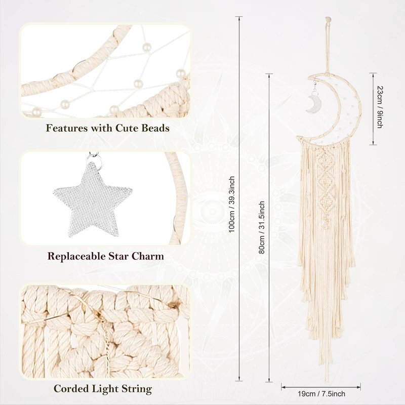 - HANDMADE DECORATION: Made from the finest cotton fibers, this dream catcher boasts a delicate and intricate pattern that exudes charm and elegance. The crescent moon shape symbolizes new beginnings and the cycles of life. Let its gentle curve embrace your dreams and aspirations.