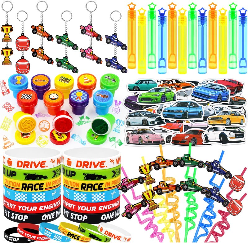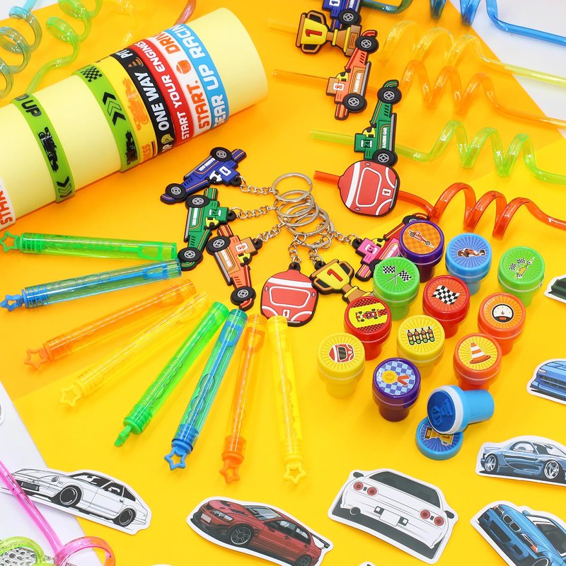 - 【Go Race Car Party】This all-in-one set includes 12 race car keychains, 12 race car silicone bracelets, 12 stampers, 12 bubble wands, 12 reusable straws, and 50 race car stickers. Each item is designed to bring joy and excitement, making it a fantastic choice for party favors, classroom rewards, or fun giveaways