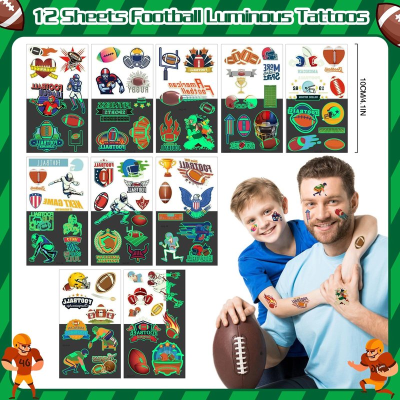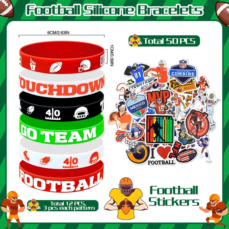 - đăFOOTBALL PARTY FAVORSăIncluding 12 sheets of football temporary tattoos, 12 football keychains, 12 football silicone bracelets, 12 football slap bracelets, 12 mini football stress balls, 50 football stickers, 12 football gift bags. Each item is designed to meet your diverse party needs with ample quantities